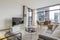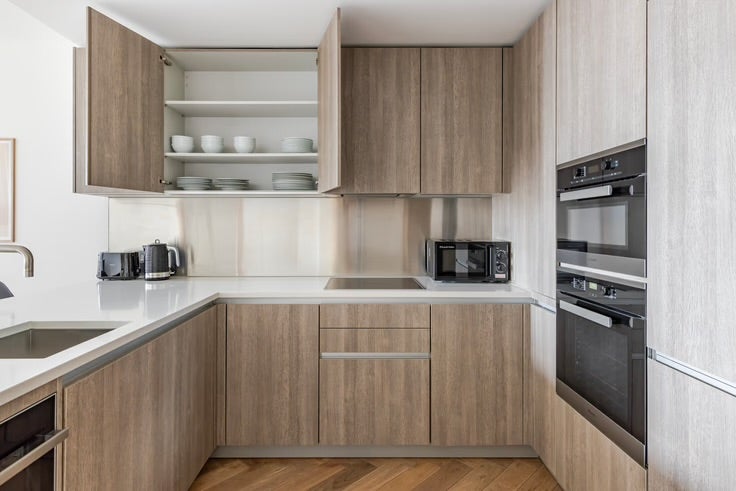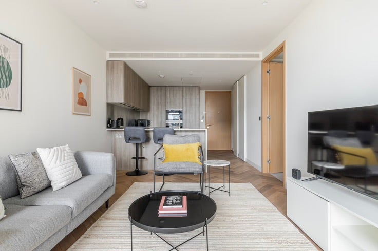 The apartment features a bright open-plan living area with modern furnishings and large windows that let in plenty of natural light. The kitchen is fully equipped with everything needed for day-to-day living, whether you’re staying short or long term.