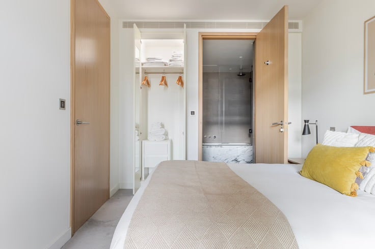 The bedroom is comfortably furnished with a good-quality bed, fresh linen, and storage space. The bathroom is modern and clean, fitted with contemporary fixtures.