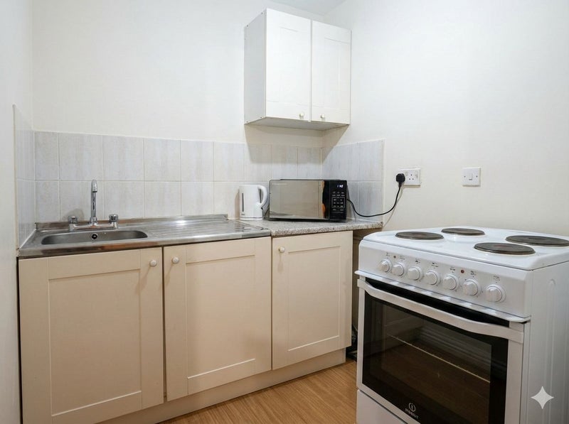 Modern Kitchen: A private, separate kitchen equipped with brand-new fitted cabinets, a stainless steel sink, and a full-size electric cooker with an oven.