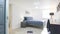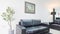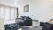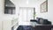The living area has a leather sofa, 65-inch, wall-mounted Smart TV.