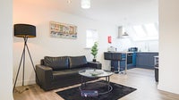 The living area comes with a leather sofa, 50-inch, wall-mounted TV with Netflix.