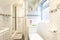 White tiled walls, WC, sink, shower cubicle, mirrored wall cabinet, chrome towel rail, spotlightsn