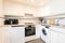 Fully tiled with white high gloss units (6 wall units, extractor fan, 3 base units with drawers), sink with drainer and mixer tap, worktop, Hotpoint fridge with freezer shelf, Whirlpool electric oven, gas hob, Siemens washing machine, 4 door cupboard space above kitchen.