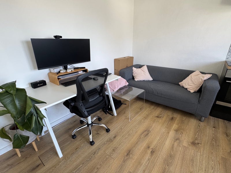 The living area includes a comfortable sofa, coffee table and a large TV. At the moment there’s also a spacious desk for working from home, which I’d be happy to leave if useful, otherwise it can be remodelled based on your needs.