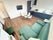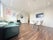 Wood flooring, white painted walls, radiator, spotlights, JVC TV on wall bracket, wall mirror, glass table & chairs, green sofa and armchair, window blind