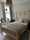 Decorated in sage green with velvet curtains and 2 large windows.