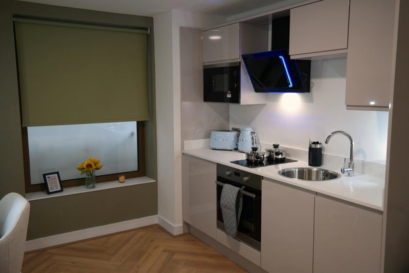 All studios are built with comfort in mind, fully furnished double bed side tables and double wardrobe, desk/workstation, ensuite bathroom and fitted kitchen with Microwave, Oven and a two-pan hob.