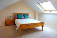 One spacious, sunny, double garden bedroom on first floor. Overlooks the garden, with 2 large dual-aspect windows. Includes a solid wooden queen-sized bed, wardrobe, and drawers.