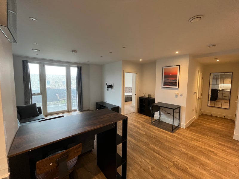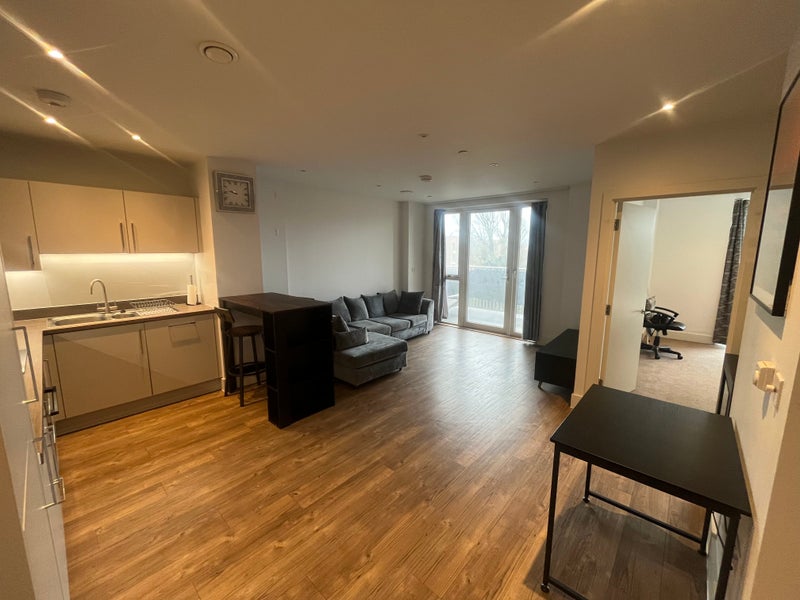 The property features a spacious open-plan living area with a modern fitted kitchen and private balcony, creating a comfortable and practical living environment ideal for working professionals.