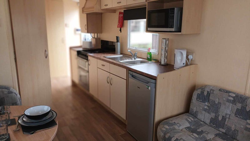 The caravan includes a cooker, TV and fridge.
