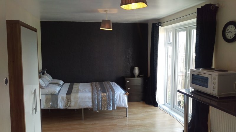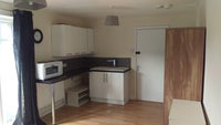 Furnished Bedsit with double bed, living space, kitchenette and own separate shower room with toilet and basin. Patio doors to garden. One person only.