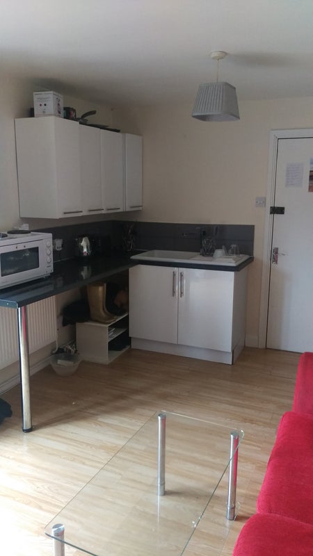 Kitchen includes large fridge freezer, table top hob & oven, microwave, kitchen units, sink and cupboards. Washing machine is in the communal area.