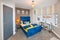 The room itself is beautiful. The room has plenty of light in the day and is a cosy bedroom when the bespoke black out blind is drawn. There is a large, upholstered midnight navy double bed with bedside table and designed caged industrial style bedside lamp. The room will come with the bed and mattress however bedding is not provided. The rooms are dressed for illustrative purposes only.