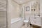 A tiled bathroom with power shower over bath, mirrored cabinet and draws under the sink.