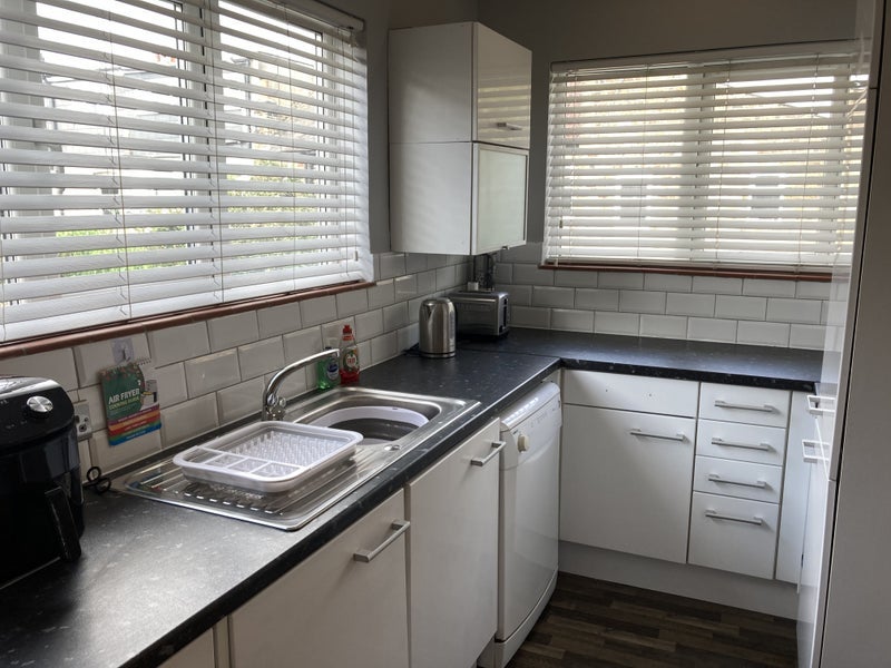 The flat features a fully equipped kitchen with an oven, fridge freezer, induction hob, air fryer, and washing machine. There is also plenty of storage space throughout.