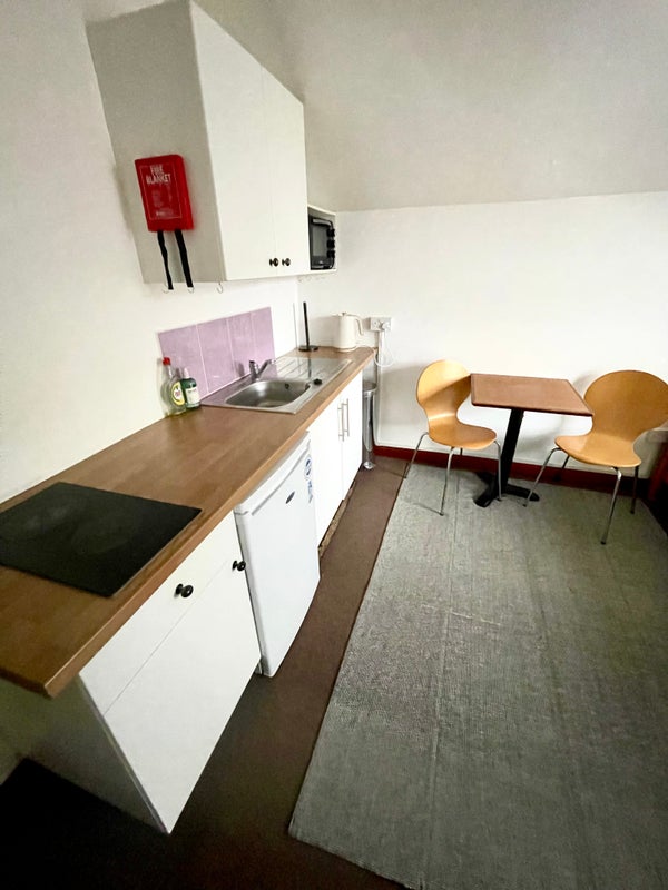 Counter top dual ceramic hob, fridge freezer, oven. Stainless steel sink,