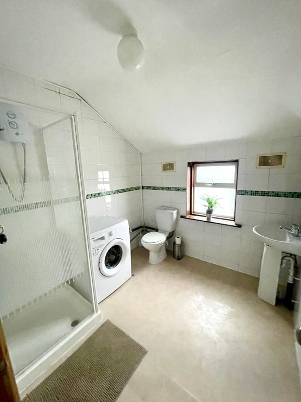 Spacious Bathroom: glass cubicle Shower, W. C. Wash Basin, new Washing Machine.
